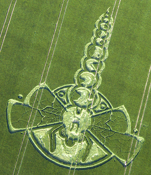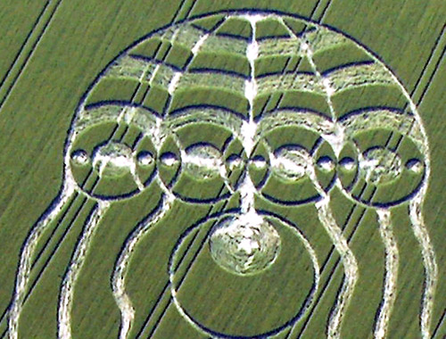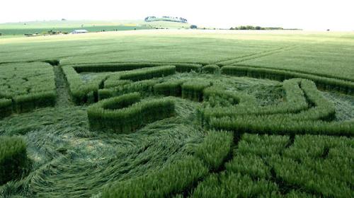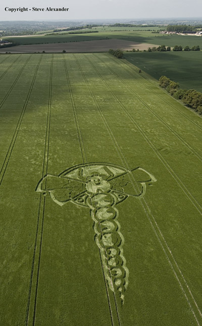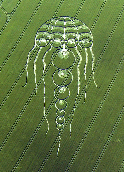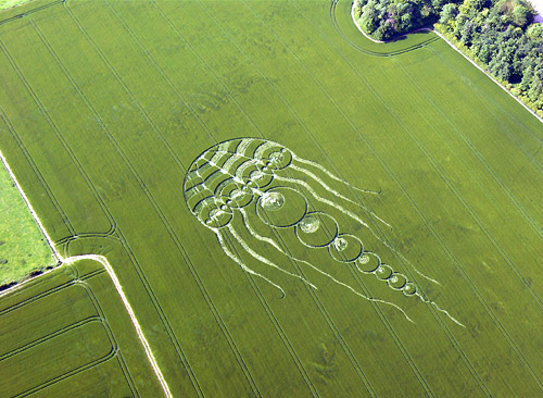 Флегматичные британцы, уже давно привыкшие к кругам загадочного происхождения, появляющимся время от времени на пшеничных полях туманного Альбиона, не на шутку встревожились после того, как 29 мая этого года в графстве Оксфордшир на одной из нив вместо кругов был обнаружен гигантский силуэт … медузы длиной 183 метра. Это, пожалуй, крупнейший из всех известных кругов на полях, до сих пор встречавшихся в Англии. Силуэт медузы настолько большой, что увидеть его целиком можно только с самолёта или вертолёта.Спустя всего восемь дней, в ночь с 5 на 6 июня, в другом графстве Соединённого Королевства – графстве Уилтшир – в местечке Йейтсбери, теперь уже на ячменном поле, было зафиксировано изображение стрекозы. Хотя размер этого изображения был в четыре раза меньше (45 м) длины изображения медузы.