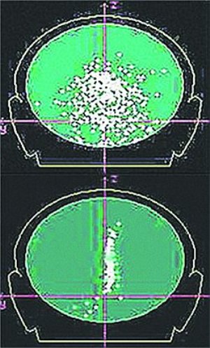 На снимке сверху — источники энергетических ритмов в мозгу обычного человека: рассыпаны хаотично. Снизу — у экстрасенса: сгруппированы в луч, который направлен прямо в темя.